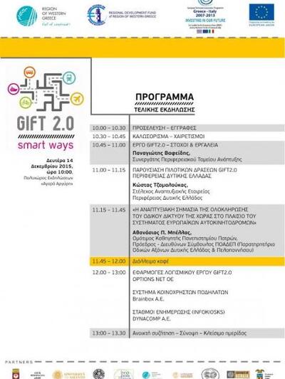 To Περιφερειακό Ταμείο Ανάπτυξης της Περιφέρειας Δυτικής Ελλάδος διοργανώνει την Δευτέρα 14 Δεκεμβρίου 2015 και ώρα 10 το πρωί μία εκδήλωση με θέμα «Παρουσίαση πιλοτικών δράσεων του έργου GIFT 2.0 Greece –Italy Facilities for Transport 2.0 του προγράμματος εδαφικής συνεργασίας Ελλάδα – Ιταλία 2007-2013», στον Πολυχώρο Εκδηλώσεων «Αγορά Αργύρη» στην Πάτρα.