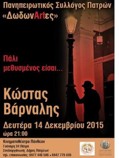 Ένα θεατρικό δρώμενο βασισμένο στο έργο και τη ζωή του λογοτέχνη Κώστα Βάρναλη θα παρουσιαστεί στο Πάνθεον, στην οδό Δημ. Γούναρη και Κανακάρη, στις 14 Δεκέμβρη 2015, από τη νεοσύστατη ομάδα «ΔωδωνARTες» του Πανηπειρωτικού Συλλόγου Πατρών.