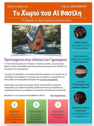 Το Χωριό του Άϊ Βασίλη είναι ήδη έτοιμο, με απίθανα σπιτάκια ανάμεσα σε δέντρα να μεταφέρουν στην πλατεία ένα καταπράσινο παραμύθι. Στις 19 και 20 Δεκεμβρίου, οι κάτοικοι της περιοχής σας περιμένουν στην πλατεία με εκδηλώσεις για τα παιδιά και τα μεγάλα παιδιά. Παιδικές χορωδίες, διαδραστικά παιδικά παραμύθια με τους μυθοπεριπατητές, ξυλόσομπες, ρακόμελο,λουκουμάδες και άλλα πολλά.