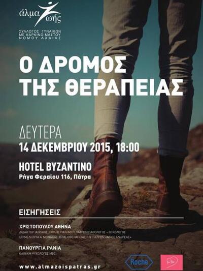 Ο Σύλλογος Γυναικών με Καρκίνο Μαστού "ΑΛΜΑ ΖΩΗΣ" Ν. Αχαΐας σας προσκαλεί στην Ημερίδα: Ο δρόμος της θεραπείας που θα πραγματοποιηθεί την Δευτέρα 14 Δεκεμβρίου στις 18.00 στο ξενοδοχείο "Βυζαντινό" .