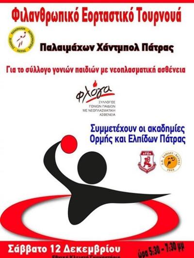 O Σύλλογος Παλαιμάχων Αθλητών Χάντμπολ της Πάτρας, διοργανώνει για δεύτερη χρονιά, φιλανθρωπικό τουρνουά στο Εθνικό κλειστό γυμναστήριο.