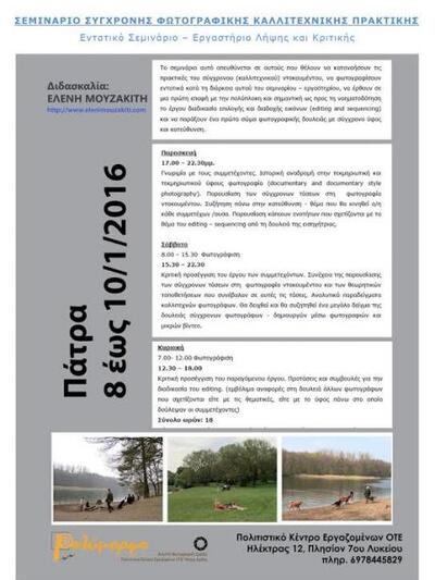 «Τάσεις και Πρακτικές στη Σύγχρονη Φωτογραφία Ντοκουμέντου» στο σεμινάριο θα διδάξει η κ. Μουζακίτη Ελένη.