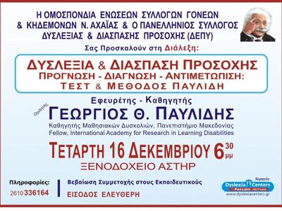 Η Ομοσπονδία Ενώσεων Συλλόγων Γονέων και Κηδεμόνων Ν. Αχαΐας και ο Πανελλήνιος Σύλλογος Δυσλεξίας και Διάσπασης Προσοχής (ΔΕΠΥ), διοργανώνουν διάλεξη με θέμα: «Δυσλεξία και διάσπαση προσοχής - Πρόγνωση, διάγνωση αντιμετώπιση: Τεστ και μέθοδος Παυλίδη».
