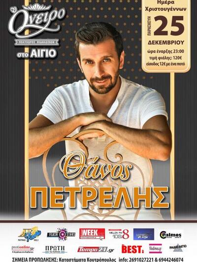 Τον Θάνο Πετρέλη θα πλαισιώσει τη βραδιά των Χριστουγέννων 25 Δεκεμβρίου, μια σπουδαία ορχήστρα και νεώτεροι τραγουδιστές που θα δημιουργήσουν μια γιορτινή ατμόσφαιρα μέχρι ……..το ξημέρωμα !!!!!!!