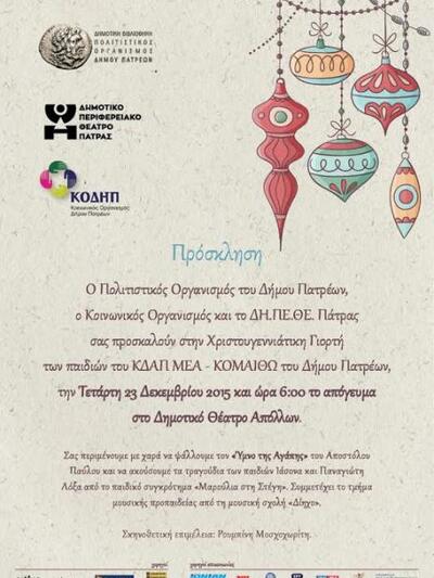 *Στο μεταξύ στις 23/12, προπαραμονή των Χριστουγέννων ο Πολιτιστικός Οργανισμός του Δήμου Πατρέων και ο Κοινωνικός Οργανισμός μαζί και με το ΔΗΠΕΘΕ Πάτρας διοργανώνουν μία Χριστουγεννιάτικη γιορτή στις 6 το απόγευμα στο Δημοτικό θέατρο Απόλλων.
