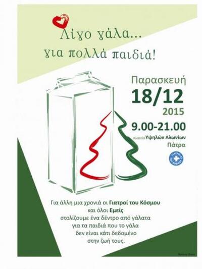 Την Παρασκευή 18 Δεκέμβρη 2015 από τις 9.00 π.μ. – 9.00 μ.μ. στην πλατεία Υψηλών Αλωνιών, στην Πάτρα, οι Γιατροί του Κόσμου μας καλούν για να φτιάξουμε όλοι μαζί ένα δέντρο αλληλεγγύης, «Ένα δέντρο από γάλα». Σε σχετική ανακοίνωση της οργάνωσης αναφέρονται τα εξής: