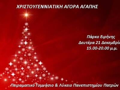 Στην Χριστουγεννιάτικη Αγορά Αγάπης που διοργανώνουν σας προσκαλούν το Πειραματικό Γυμνάσιο και Λύκειο του Πανεπιστημίου Πατρών. Θα πραγματοποιηθεί στο Πάρκο της Ειρήνης (Πανεπιστημιούπολη) το απόγευμα της Δευτέρας 21 Δεκεμβρίου 2015 από τις 15.00 έως τις 20.00 μμ.