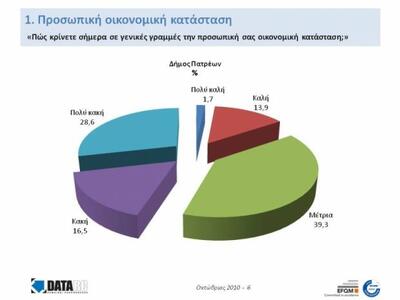 Εννέα στους δέκα Πατρινούς έχουν περιορίσει τις αγορές τους λόγω μνημονίου και σκληρών οικονομικών μέτρων, ενώ σχεδόν οι μισοί φοβούνται μήπως χάσουν τη δουλειά τους. Σχεδόν το 50% των ερωτηθέντων επίσης εκτιμά ως κακή ή πολύ κακή την προσωπική οικονομική του κατάσταση.