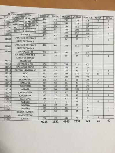 22:32 Με μόλις δύο εκλογικά κέντρα να απομένουν τα αποτελέσματα στην Αχαΐα έχουν ως εξής: