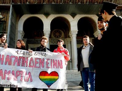 Συγκέντρωση έξω από τη Μητρόπολη Αθηνών έκαναν το μεσημέρι της Τρίτης ομοφυλοφιλικές οργανώσεις για να διαμαρτυρηθούν για τη στάση του Μητροπολίτη Καλαβρύτων και Αιγιαλείας Αμβρόσιου, στην επέκταση του συμφώνου συμβίωσης και στα ομόφυλα ζευγάρια.