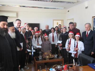 Τα καθιερωμένα κάλαντα των Χριστουγέννων παιάνισε σήμερα Πέμπτη, παραμονή Χριστουγέννων, 24 Δεκεμβρίου 2015 η μπαντίνα του Ιερού Ναού της Αγίας Σοφίας.