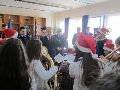 Όπως βλέπουμε στις φωτογραφίες που μας εστάλησαν, η Μπαντίνα με μαέστρο και αρχιμουσικό τον συμπολίτη Νίκο Λιόπετα, επισκέφθηκε τον Γενικό Περιφερειακό Αστυνομικό Διευθυντή Δυτικής Ελλάδος Υποστράτηγο Αριστείδη Ανδρικόπουλο και παρουσίασε τα Χριστουγεννιάτικα παραδοσιακά κάλαντα. Παρών ήταν και ο Διευθυντής της Δνσης Αστυνομίας Αχαΐας Ταξίαρχος Ιωάννης Σειντής.