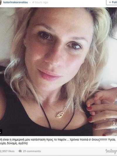 Το μεσημέρι των Χριστουγέννων η Κατερίνα Καραβάτου ανέβασε μία φωτογραφία στον προσωπικό της λογαριασμό στο Instagram μία φωτογραφία, η οποία την απεικόνιζε στο κρεβάτι.