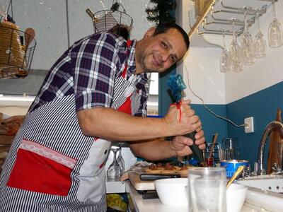 Ενθουσίασαν οι εκλεπτυσμένες γευστικές δημιουργίες του Πατρινού φαρμακοποιού και σεφ Γιώργου Κολλυρόπουλου, προχθές προπαραμονή Πρωτοχρονιάς στο ΚΕΛΛΑΡΙ 151 της Μαιζώνος στην Πάτρα. Από τις 2 το μεσημέρι οι θαμώνες που γέμισαν ασφυκτικά το μαγαζί, δοκίμασαν χοιρομέρι, σούπα βελουτέ κάστανο με λάδι τρούφας, και ταρτάκια με μους σοκολάτας, ενώ ο ίδιος δεχόταν συγχαρητήρια για τις μαγειρικές του ικανότητες.