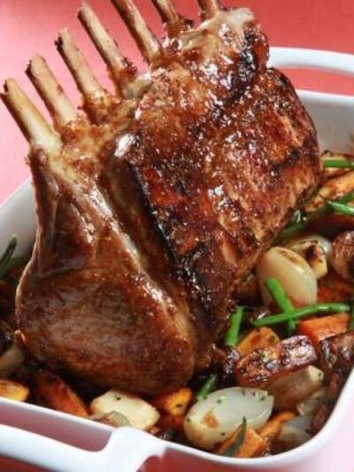 Για το χοιρινό καρέ 1 κιλό χοιρινό καρέ, με κόκαλο 1 κιλό άλμη ελαιόλαδο Για τη σάλτσα μέλι-μουστάρδα 10 γρ. ελαιόλαδο 150 γρ. κρεμμύδι, κομμένο σε λεπτές φέτες 8 γρ. σκόρδο σε σκελίδες, σπασμένο 150 γρ. κρασί λευκό 200 γρ. ζωμό κοτόπουλο 400 γρ.σάλτσα ντέμι γκλας 60 γρ. μέλι 10 γρ. μουστάρδα Ντιζόν 40 γρ. μουστάρδα με κόκκους θυμάρι φρέσκο δενδρολίβανο φρέσκο αλάτι Για τα λαχανικά 160 γρ. ελαιόλαδο 100 γρ. καρότα, κομμένα σε χοντρά στικς 100 γρ. σελινόριζα, κομμένη σε χοντρά καρέ 80 γρ. μανιτάρια στρογγυλά, κομμένα στα τέσσερα 80 γρ. κρεμμύδια εσαλότ 100 γρ. φασολάκια, βρασμένα 10 γρ. τσάιβς, ψιλοκομμένο 5 γρ. θυμάρι, ψιλοκομμένο 5 γρ. μαϊντανός, ψιλοκομμένος 20 γρ. βούτυρο αλάτι
