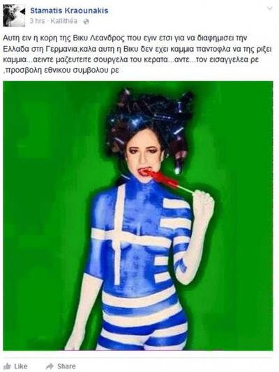 Ο αγαπημένος Έλληνας καλλιτέχνης σχολίασε χαρακτηριστικά: «Αυτή ειν η κορη της Βίκυ Λέανδρος που εγιν έτσι για να διαφημίσει την Ελλάδα στη Γερμάνια, καλά αυτή η Βίκυ δεν έχει καμιά παντόφλα να της ρίξει καμιά...αειντε μαζευτείτε σούργελα του κερατά...άντε...τον εισαγγελέα ρε ,προσβολή εθνικού σύμβολου ρε».