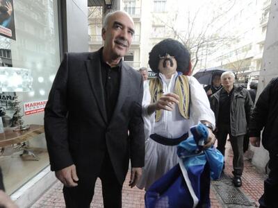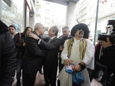 Ο Βαγγέλης Μεϊμαράκης πάντως δεν φάνηκε να πτοείται και συνομίλησε με τη φιγούρα της σατιρικής εκπομπής, ενώ μαζί πόζαραν κρατώντας τη σημαία του κόμματος.