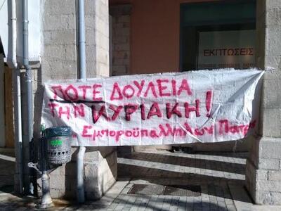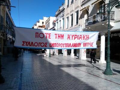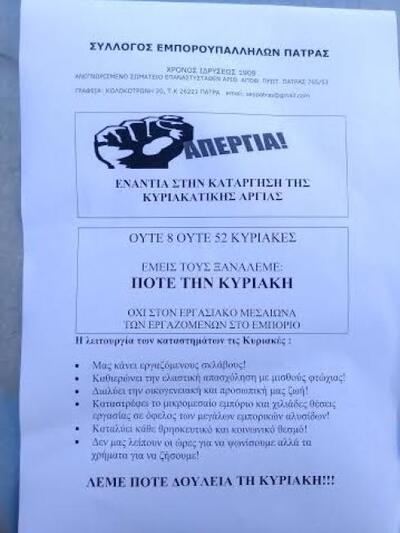 Οι εμποροϋπάλληλοι της Πάτρας όπως αναφέρουν σε ανακοίνωση του διοικητικού τους συμβουλίου, συμμετέχουν δυναμικά στην 24ωρη πανελλαδική απεργία που προκήρυξε η Ομοσπονδία τους (ΟΙΥΕ) για σήμερα Κυριακή 17.1.2016, ενάντια στο συνεχιζόμενο άνοιγμα των καταστημάτων τις Κυριακές και πραγματοποίησαν απεργιακή συγκέντρωση στην οδό Μαιζώνος και Αγίου Νικολάου, στην Πάτρα, στις 10.30 το πρωί.