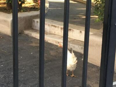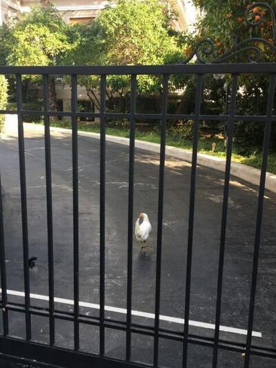 Άφησε μια κούτα που κράταγε στα χέρια της και μια άσπρη κότα από τα κάγκελα της πόρτας του Μαξίμου, την έριξε στον περίβολο.
