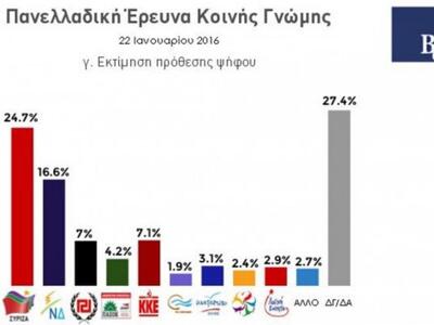 Ειδικότερα, στην εκτίμηση πρόθεσης ψήφου ο ΣΥΡΙΖΑ συγκεντρώνει 24,7%, με τη Ν.Δ. να ακολουθεί με 16,6%. Τρίτο βρίσκεται το ΚΚΕ το οποίο συγκεντρώνει 7,1%, με τη Χρυσή Αυγή να συγκεντρώνει 7%.