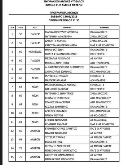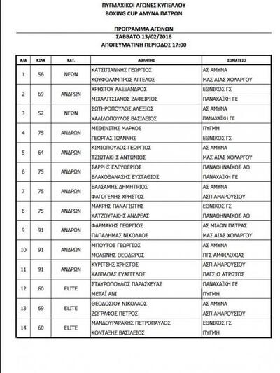 Έγιναν γνωστά τα ζευγάρια των αθλητών που θα αναμετρηθούν στο τουρνουά πυγμαχίας "Boxing Cup 2016" που διοργανώνει η Άμυνα, στις 13 Φεβρουαρίου στο κλειστό γυμναστήριο στο Κουκούλι.