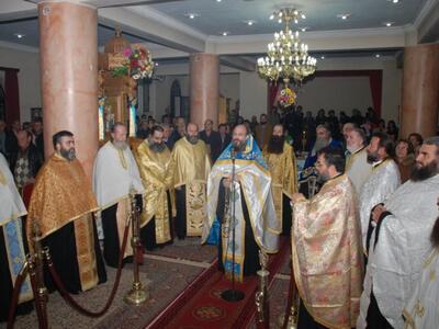 Το εσπέρας της Τρίτης 9 Φεβρουαρίου έλαβε χώρα ο Μέγας πανηγυρικός Εσπερινός μετά Αρτοκλασίας εις τον οποίο προέστη και ομίλησε επικαίρως ο πανοσιολογιώτατος Αρχιμανδρίτης π. Ειρηναίος Σωτηρόπουλος, προϊστάμενος του Ιερού Ναού Αγίας Ειρήνης Ριγανοκάμπου Πατρών, Αρχιερατικός Επίτροπος της περιφερείας Μόβρης και υπεύθυνος του Γραφείου Νεότητος της καθ΄ ημάς Ιεράς Μητροπόλεως.
