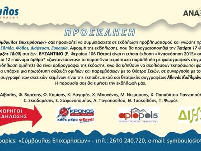 Η εβδομαδιαία οικονομική εφημερίδα «Σύμβουλος Επιχειρήσεων» προγραμματίζει για την Τετάρτη 17 Φεβρουαρίου εκδήλωση προβληματισμού και γνώσης προσανατολισμένη στις έννοιες Ελπίδα, Φόβος, Διάψευση, Ευκαιρία. Αφορμή της εκδήλωσης, που θα πραγματοποιηθεί στο ξεν. ΒΥΖΑΝΤΙΝΟ (Ρ.Φεραίου 106 Πάτρα) είναι η ετήσια έκδοση «Ανασκόπηση 2015» στην οποία 12 σημαντικές προσωπικότητες αρθρογραφούν* «ζωντανεύοντας» το παραπάνω τετράπτυχο, παράλληλα με δεκάδες φωτογραφικές στιγμές του 2015.