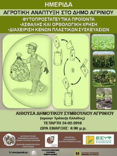 Ο Δήμος Αγρινίου και η Διοικούσα Επιτροπή του Παραρτήματος Πελοποννήσου &Δυτικής Στερεάς Ελλάδας του ΓΕΩΤΕΕ, διοργανώνουν ημερίδα με θέμα «Φυτοπροστατευτικά προϊόντα:ασφαλής και ορθολογική χρήση, διαχείριση κενών πλαστικών συσκευασιών» βάσει της κείμενης νομοθεσίας για τη διάθεση, ορθολογική χρήση των γεωργικών φαρμάκων (Ν. 4036/2012, Ν. 4253/2014) καθώς και την ορθή διαχείριση των κενών συσκευασιών τους (Ν. 2939/2001 ΚΥΑ 9268/469/2007 Εθνικό σχέδιο Δράσης, ΦΕΚ Β’ 1883/2013).