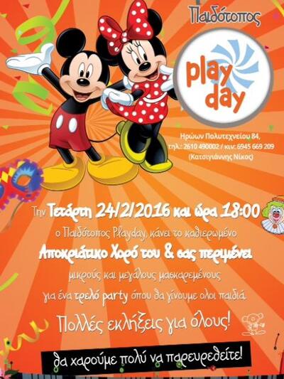 Ο Μίκυ και η Μίνι, προσκαλούν αυτή την Τετάρτη 24/2 το απόγευμα, μικρούς και μεγάλους μασκαρεμένους, στον πιο τρελό αποκριάτικο χορό! Κέφι, χορός, μουσικές & πολλές εκπλήξεις για όλους και φέτος στο Play Day.