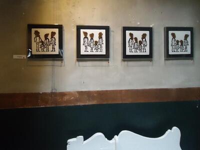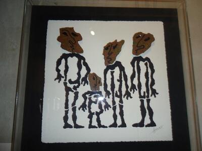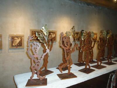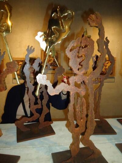 Πρόκειται για μια «παρέλαση» προσωπικών και καθολικών «ηρώων» και βιωμάτων, καθώς ο καλλιτέχνης είναι πιστός καρναβαλιστής. Moιάζει σαν να ξεπήδησαν έξω από το χαρτί σκίτσα τρεμουλιαστά, σαν χαλκομανίες. Δεσπόζουν το μαύρο, το καφέ, ο τόνος του μπρούντζου και του χρυσού. Τα όρθια, μεταλλικά (ασήκωτα) γλυπτά παραπέμπουν στο θρυλικό καρναβαλικό πλήρωμα «Κλαυσίγελος ή Ασπρο- μαύρο» μέσα από τις πομπές και την αξεπέραστη περιοδεύουσα μπάντα του, σε γκρουπ πιερότων με το ζωγράφο -καρναβαλιστή Γιώργο Μπογδανόπουλο, ενώ τα επιτοίχια στο τρίτο, μασκοφόρο πρόσωπο του Ιανού.