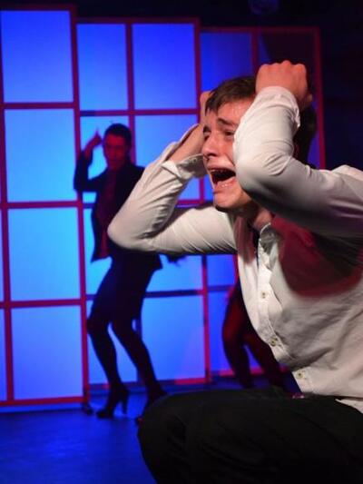 Ξεκινάει σκοτεινά, με μπλε φωταγώγηση ενός «παραβάν» που καταλήγει σε έγκλημα-μυστήριο στο μπαλκόνι. Περνάμε σε κινηματογραφικού τύπου προβολή του τίτλου της παράστασης με καρτουνίστικη γραφή και μαγνητοφωνημένο υποβολέα.