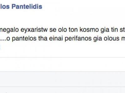 «Θέλω να πω ένα μεγάλο ευχαριστώ σε όλο τον κόσμο για την στήριξή τους σε όλους τους τομείς. Ο Παντέλος θα είναι περήφανος για όλους μας να είσαστε σίγουροι», έγραψε, στη προσωπική σελίδα του στο Facebook.