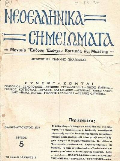 Το περιοδικό Νεοελληνικά Σημειώματα, είναι μηνιαία έκδοση, ελέγχου κριτικής και μελέτης και κυκλοφόρησε από το Μάρτη του 1937, το πρώτο τεύχος, έως τον Ιούλιο - Αύγουστο 1937, το 5ο τεύχος.