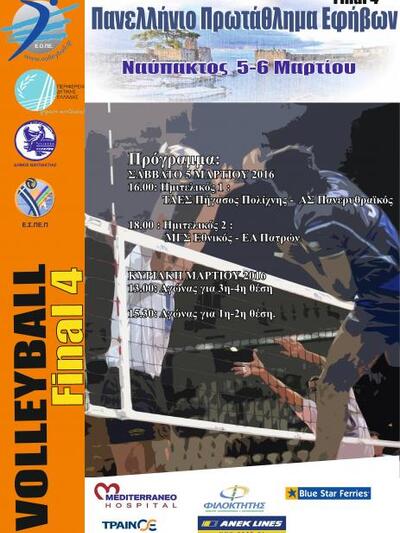 Ο Δήμος Ναυπακτίας, η Ελληνική Ομοσπονδία Πετοσφαίρισης (Ε.Ο.ΠΕ) και η Περιφέρεια Δυτικής Ελλάδας, διοργανώνουν την Τελική Φάση του Πανελλήνιου Πρωταθλήματος Βόλεϊ Εφήβων 2015-2016, στη Ναύπακτο.