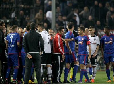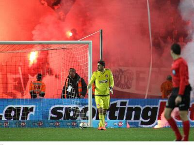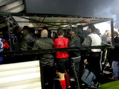 Μετά από ένα τέταρτο ο διαιτητής παρά τις δυο διακοπές επιχείρησε να αρχίσει εκ νέου το ματς, αλλά με την είσοδό του άρχισαν και πάλι φωτοβολίδες, εισβολή οπαδών στον αγωνιστικό χώρο και παρέμβαση των ΜΑΤ.