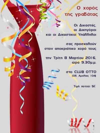 Οι ∆ικαστές, oι ∆ικηγόροι και οι ∆ικαστικοί Υπάλληλοι σας προσκαλούν στον αποκριάτικο χορό τους την Τρίτη 8 Μαρτίου 2016, ώρα 9.30μ.μ. στο CLUB OTTO (Οѳ. Αμαλίας 104).