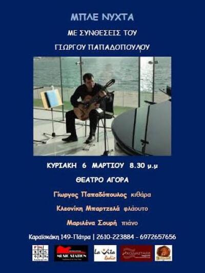 Ο τίτλος της μουσικής εκδήλωσης είναι «Μπλε Νύχτα» κι όπως αναφέρει το σχετικό δελτίο Τύπου, πρόκειται για ένα ονειρικό μουσικό ταξίδι που θα λάβει χώρα στην ατμόσφαιρα και τις αποχρώσεις μιας Μπλε Νύχτας στη σκηνή του θεάτρου Αγορά της Πάτρας, στην οδό Καραϊσκάκη 149.