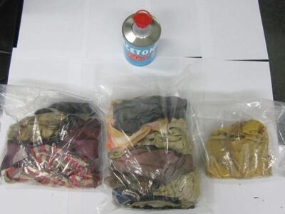 Από έρευνα που διενεργήθηκε στο χώρο βρέθηκαν και κατασχέθηκαν: Τρείς πλαστικές σακούλες με έντονη οσμή εύφλεκτου υγρού, ένα πλαστικό δοχείο χωρητικότητας 4 λίτρων, που περιείχε εύφλεκτο υγρό στο μεγαλύτερο τμήμα του, ένα σακίδιο με πριονίδι, εμποτισμένο με εύφλεκτο υγρό, μία πλαστική σακούλα επίσης με πριονίδι, εμποτισμένο με εύφλεκτο υγρό, 16 κομμάτια υφασμάτων με έντονη οσμή εύφλεκτου υγρού κι ένα μεταλλικό δοχείο με υγρό άγνωστης σύστασης.