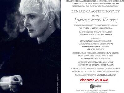 Ο Σύλλογος Νέων Καλλιτεχνών Πατρών, σε συνεργασία με το ΔΗ.ΠΕ.ΘΕ. Πάτρας, τις Εκδόσεις Πατάκη και το βιβλιοπωλείο Discover your Way διοργανώνουν την παρουσίαση του βιβλίου της ηθοποιού Ξένιας Καλογεροπούλου με τίτλο: