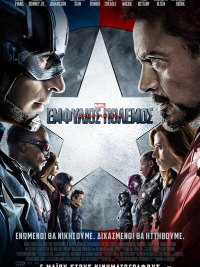 Οι Anthony Russo και Joe Russo (Captain America 2: O Στρατιώτης του Χειμώνα) επιστρέφουν και μας παρουσιάζουν τις νέες περιπέτειες του Cap στην ταινία Captain America: Εμφύλιος Πόλεμος. Τον πρωταγωνιστικό ρόλο αναλαμβάνει και πάλι ο 35χρονος σταρ Chris Evans (υποδύεται ξανά τον Steve Rogers/Captain America). Στην πραγματικότητα, πρόκειται για μια συναρπαστική σύναξη σούπερ ηρώων και χαρακτήρων του κόσμου της Marvel, αφού προελαύνουν από μπροστά μας οι: Spider-Man (Tom Holland), Ant-Man (Paul Rudd), Iron Man (Robert Downey Jr.), Hawkeye (Jeremy Renner), Scarlet Witch (Elizabeth Olsen), Vision (Paul Bettany), Winter Soldier (Sebastian Stan) και φυσικά η Black Widow (Scarlett Johansson).