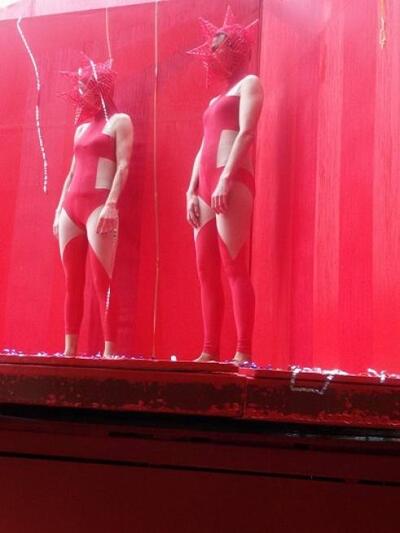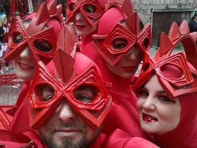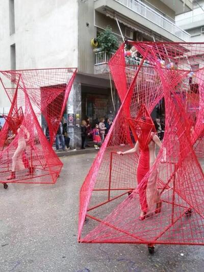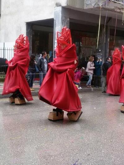 Τί είδαμε λοιπόν; Κατασκευές με κόκκινους περιστροφικούς ιμάντες να σπρώχνονται από τις «ιέρειες» της ομάδας μπροστά, ομάδα με μανδύες,πολυγωνικές μάσκες και ξύλινους κώθορνους και άρματα με εναλασσόμενες εικόνες στάσης και κίνηση με ιμάντες. Πάντα με αδυναμία στη μονοχρωμία, τα μέλη του γκρουπ, ούτε γελούν, ούτε τρέχουν,ούτε χορεύουν. Είναι σαφής ο στόχος να διαφέρουν εντελώς από όλες τις άλλες συμμετοχές. Φέτος μάλιστα χάρη στη διακοπή ροής του ενάμισι χιλιομέτρου λόγω βροχής, τεχνικών προβλημάτων αλλά και της αργής παρουσίας του 86 έκαναν ακόμα πιο αισθητή την παρουσία τους εκμεταλλευόμενοι το διάλειμα. Οι λεπτομέρειες της στολής είναι εντελώς στυλιζαρισμένες-in vogue, για φωτογράφιση ασυζητητί. Εδώ καμία παραφωνία σε παπούτσι, καμία διαφορά στο μακιγιάζ, κανένα αξεσουάρ ξεχασμένο. Μιλάμε για πειθαρχία...
