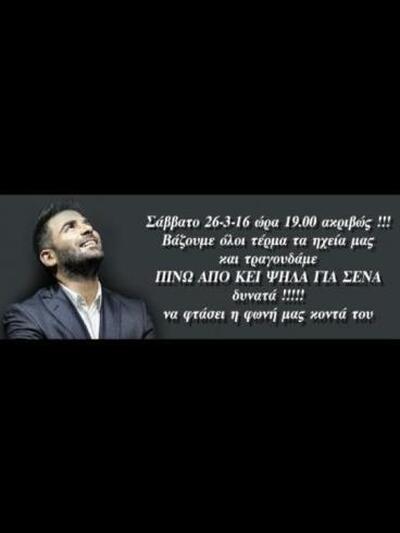 Σύμφωνα λοιπόν με φωτογραφία του Παντελή Παντελίδη που αναρτήθηκε στην σελίδα στο facebook, η οικογένεια του δημοφιλούς τραγουδιστή, καλεί όλους όσους τον θαύμασαν και τον αγάπησαν να βάλουν τέρμα στα ηχεία το τραγούδι "Πίνω από εκεί ψηλά για σένα" δυνατά το Σάββατο 26 Μαρτίου, ακριβώς στις 7 το απόγευμα...