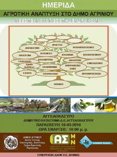 Ο Δήμος Αγρινίου σε συνεργασία με τη Δ/νση Αγροτικής Οικονομίας και Κτηνιατρικής (ΔΑΟΚ), ΠΕ Αιτ/νίας της Περιφέρειας Δυτικής Ελλάδας, τον Αγροτικό Συνεταιρισμό Μεσολογγίου-Ναυπακτίας «Η Ένωση» και την «ΕΛΑΝΚΟ Ελλάς» διοργανώνει ημερίδα με θέμα ‘Νέες Τεχνολογίες στη Δενδροκομία’.