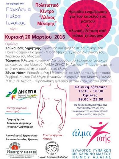 Την Τετάρτη 23 Μαρτίου 2016, στα γραφεία του Συλλόγου Γυναικών με Καρκίνο Μαστού "'ΑΛΜΑ ΖΩΗΣ" Ν. Αχαΐας, Γούναρη 37 (4ος όροφος), θα πραγματοποιηθεί το Κοινωνικό Ιατρείο Μαστού για τις ανασφάλιστες γυναίκες για τον μήνα Μάρτιο.