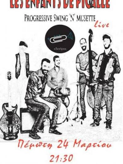 Αυτή την Πέμπτη 24 Μαρτίου 2016, στις 21:30 το βράδυ, το καφέ μπαρ/πολυχώρος «Συνδετήρας» θα παρουσιάσει τους "Les Enfants de Pigalle". Ένα κουαρτέτο που αναβιώνει Swing Parisien και alternative musette.
