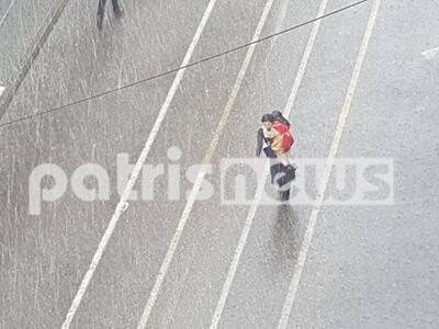 Ακόμη, αίσθηση προκάλεσε μια γυναίκα η οποία παρά την δυνατή βροχή, έχοντας στην αγκαλιά της το παιδί της, παρέλασε μόνη της κρατώντας την ελληνική σημαία.