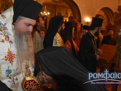 Η υποδοχή είχε γίνει από το Σεβασμιότατο Μητροπολίτη Νέας Κρήνης και Καλαμαριάς κ. Ιουστίνο και τον Θεοφιλέστατο Επίσκοπο Θεουπόλεως κ. Παντελεήμονα, εν μέσωπλήθους κόσμου, στην πλατεία Σκρα, πλησίον του Ιερού Ναού (η φωτ. είναι από το εκκλησιαστικό σάιτ romfea.gr).