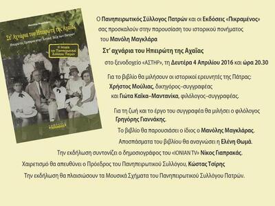 Από τις Πατρινές εκδόσεις «Πικραμένος» κυκλοφορεί αυτή την εβδομάδα το βιβλίο του καθηγητή Μανόλη Μαγκλάρα «Στ’ αχνάρια του Ηπειρώτη της Αχαΐας».
