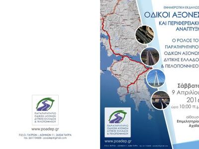 Το Παρατηρητήριο Οδικών Αξόνων Δυτικής Ελλάδας και Πελοποννήσου (Π.Ο.Α.Δ.Ε.Π.) www.poadep.gr διοργανώνει ενημερωτική εκδήλωση το Σάββατο, 9 Απριλίου 2016, ώρα 10 π.μ. στην αίθουσα του Επιμελητηρίου Αχαΐας με θέμα «Οδικοί Άξονες και Περιφερειακή Ανάπτυξη- Ο ρόλος του Παρατηρητηρίου Οδικών Αξόνων Δυτικής Ελλάδας και Πελοποννήσου».