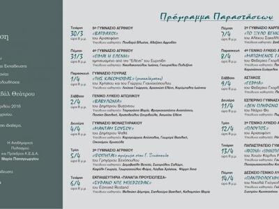 Το ξεκίνημα γίνεται την Τετάρτη 30 Μαρτίου με το 5ο Γυμνάσιο Αγρινίου και την Αριστοφανική παράσταση «Βάτραχοι», με υπεύθυνους καθηγητές τους Πουδαρά Βλωτίνα -Αλεξάκη Αφροδίτη.